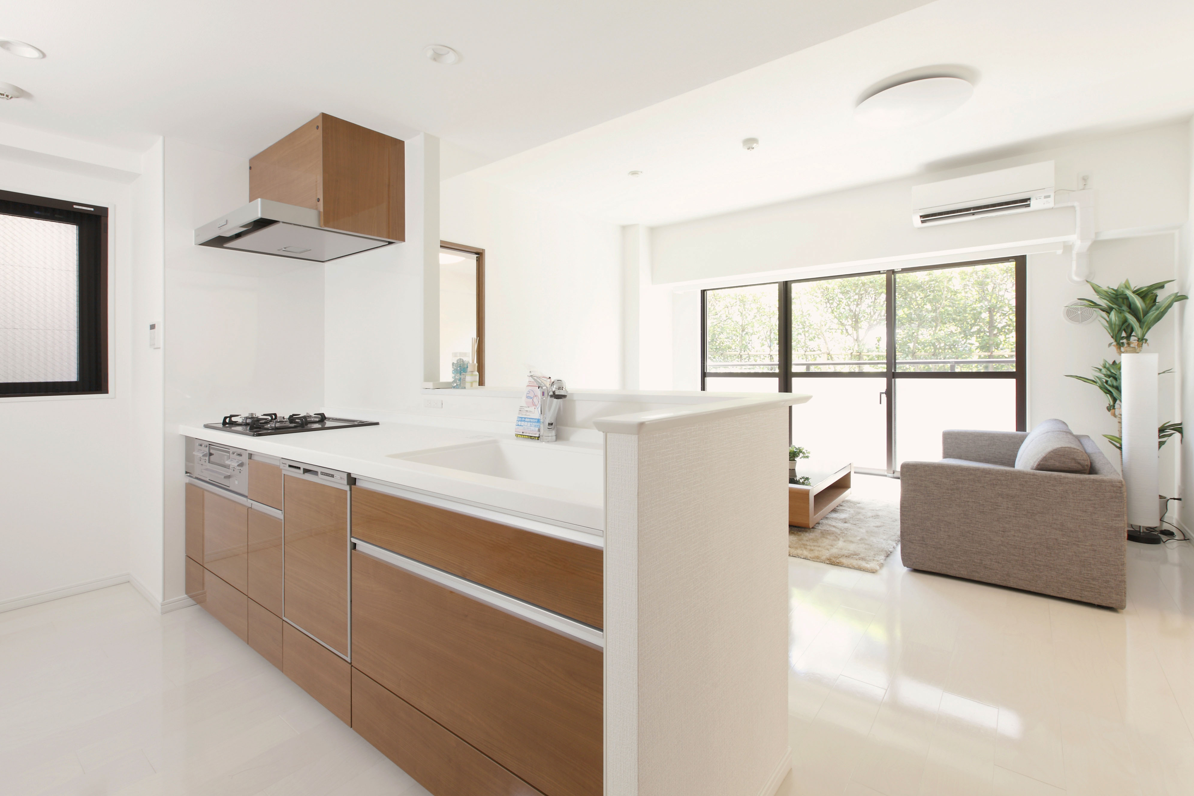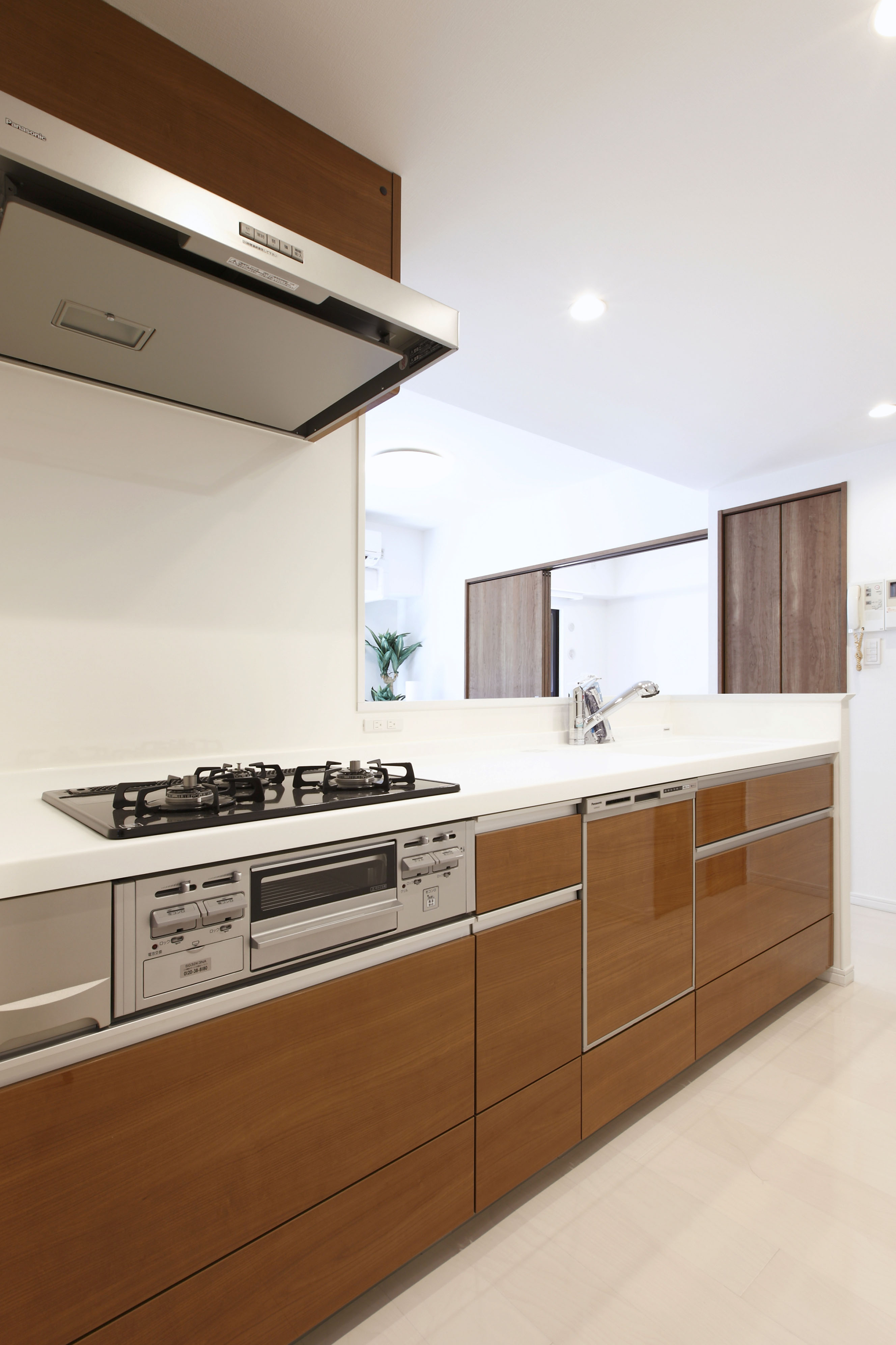 廊下を渡ると、約14.3帖のリビングダイニングキッチン♪♪キッチンはブラウンが並び落ち着いた雰囲気です。対面式なので料理も楽しめますね。