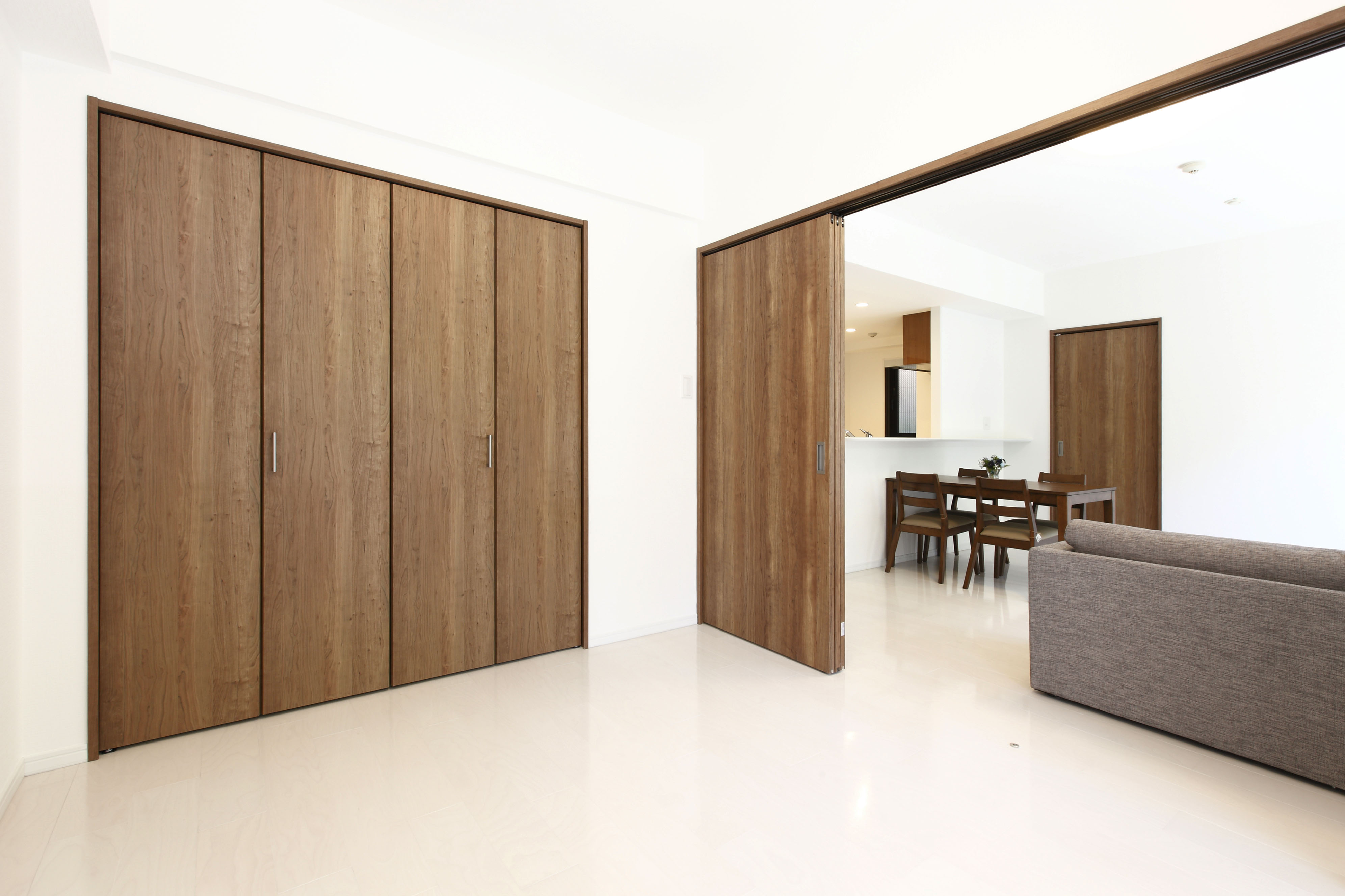 こちらが約5.6帖の洋室です。ブラウンの扉をスライドするとリビングと繋がり、約20帖の広い空間になります♪♪