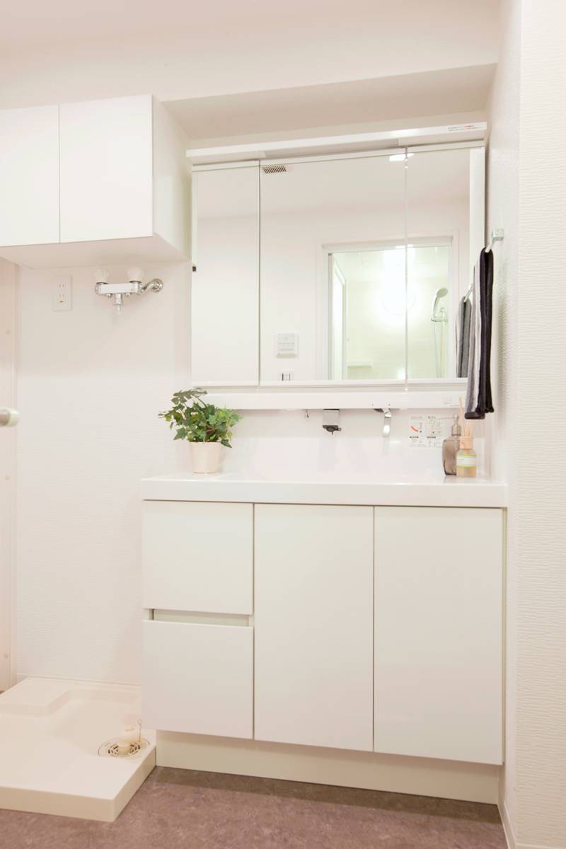 洗面化粧台も白に統一され清潔感があります。隣は洗濯機置場・トイレ・バスルームがまとまったサニタリールームです。