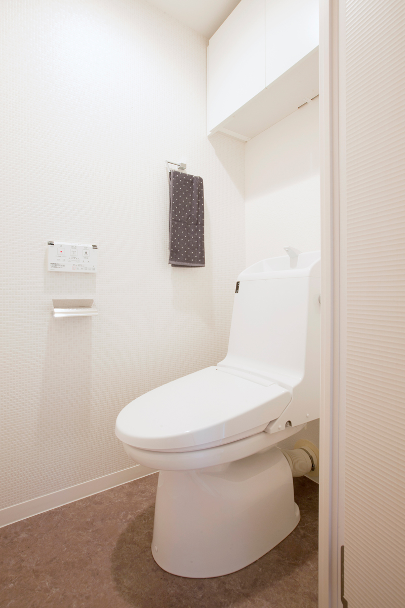 ウォシュレットが完備されたトイレ。背後には吊戸棚があり、ペーパー等も沢山ストックしておけますよ