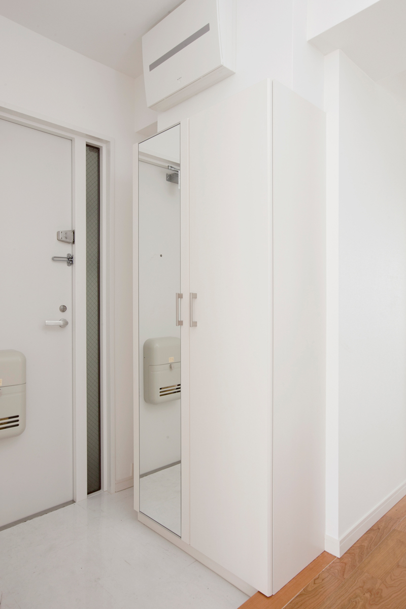 こちらが玄関です。シューズボックスが大きいので、玄関周りは常にスッキリと保つことができます。またミラーになっているのでお出かけ前の身だしなみも確認できますね!
