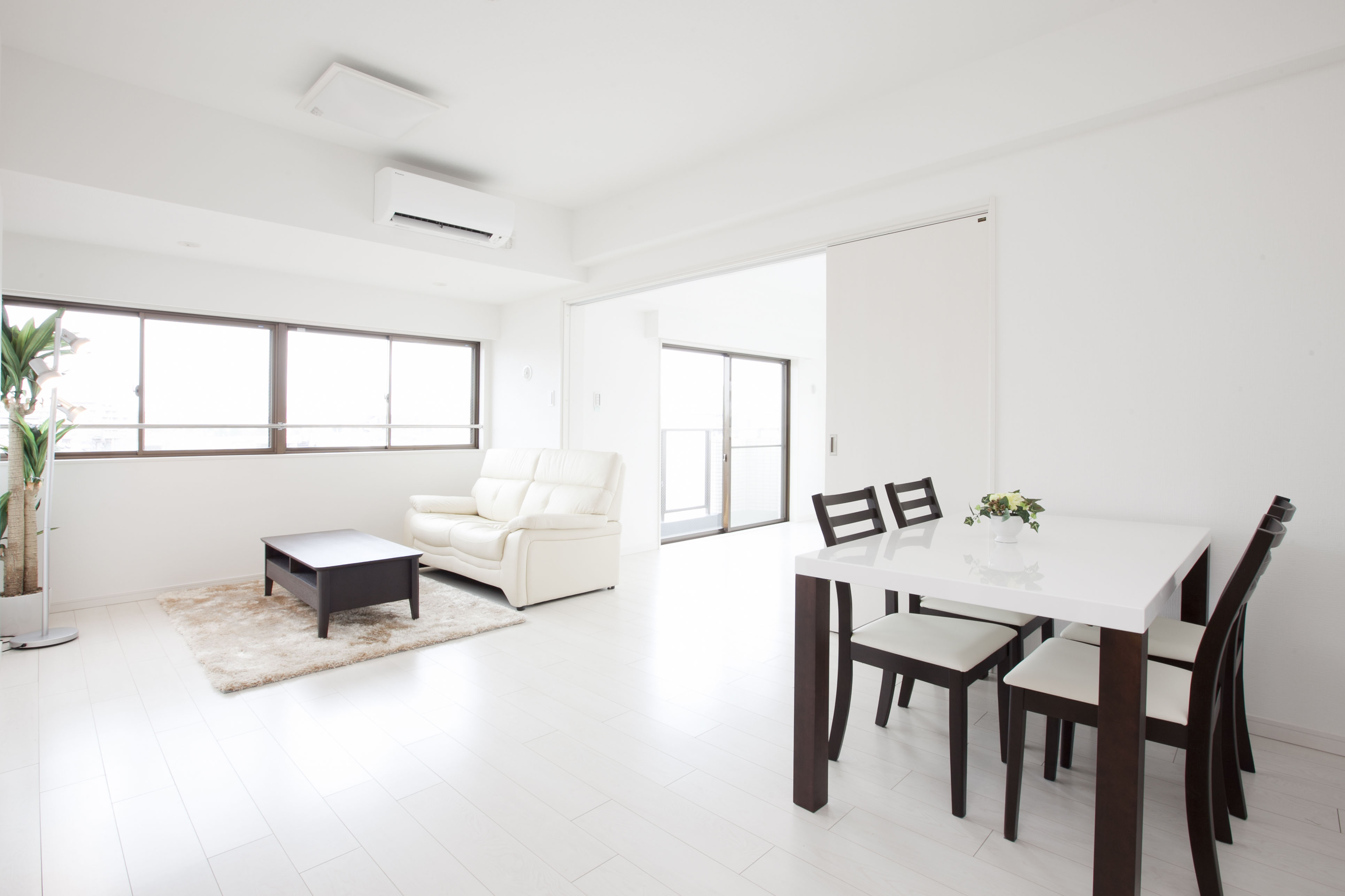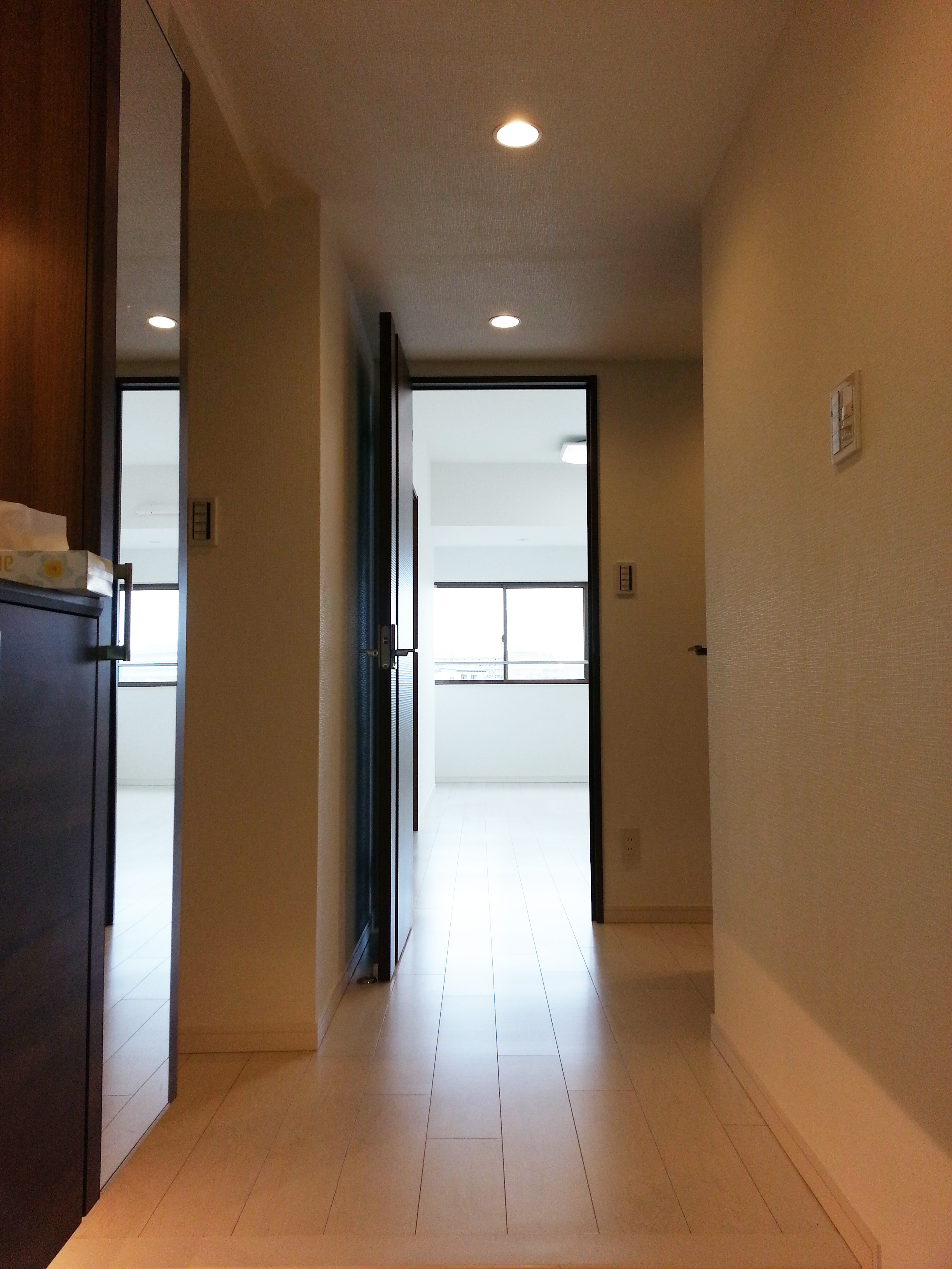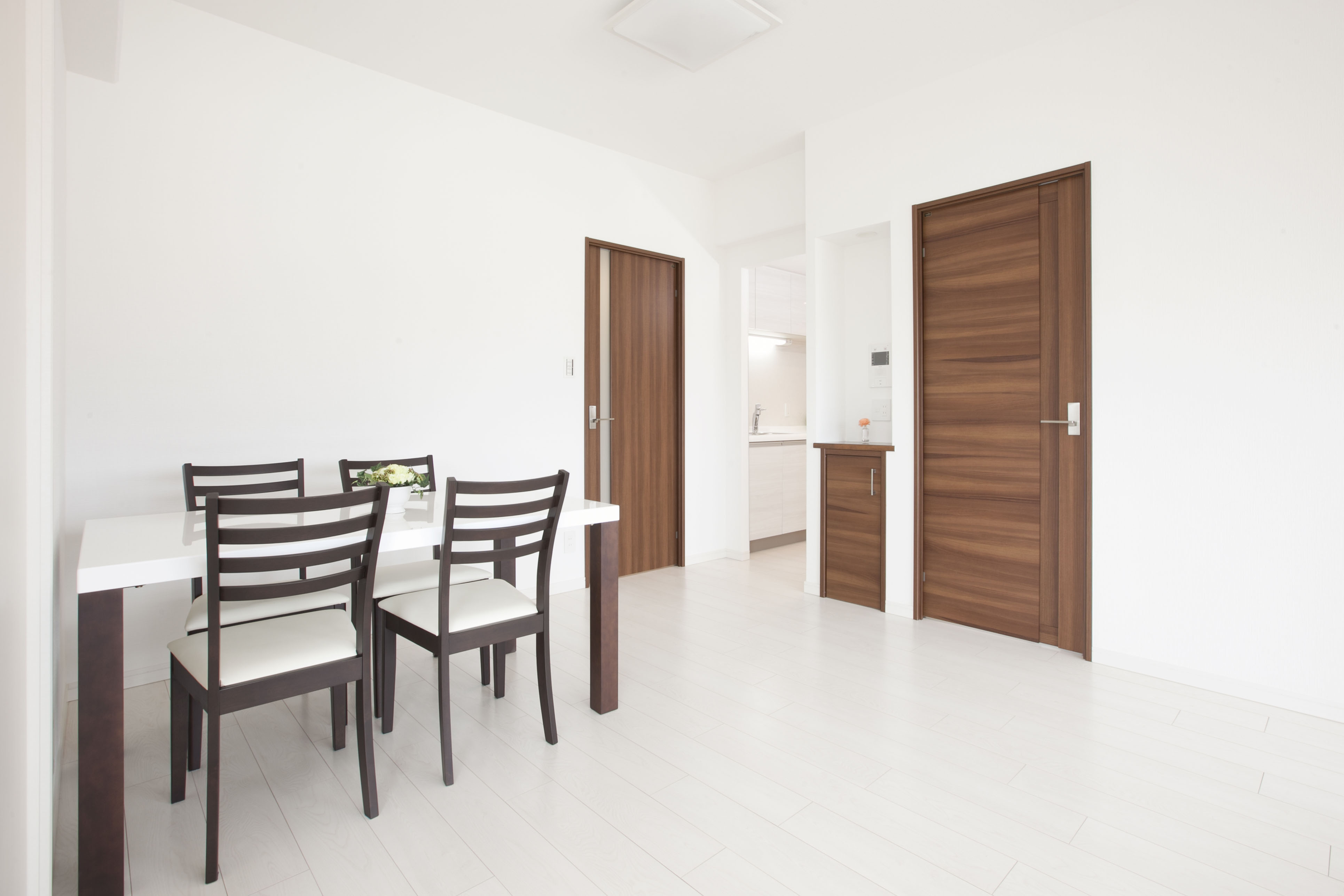 廊下を歩いて正面はリビングダイニングになります♪約10帖のダイニングキッチンは白のクロスと深い色合いのドアでグッと落ち着きのある空間に♪